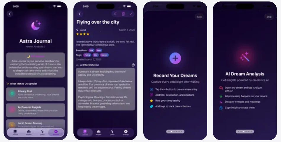 Every night, your mind tells a story—strange, symbolic, emotional, and often forgotten before your feet even touch the floor. Astra Journal was created for the dreamer who wants to remember, understand, and grow from those stories. It’s a beautifully crafted dream journal powered by 100% on‑device AI, designed to help you capture your dreams, decode their meaning, and even learn the art of lucid dreaming.