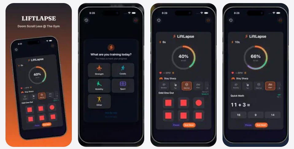 Most brain training apps are long and distracting. LiftLapse games are designed specifically for short rest windows between sets.